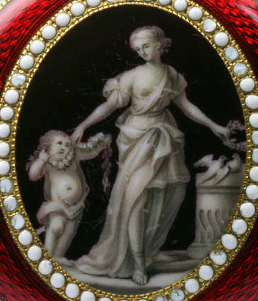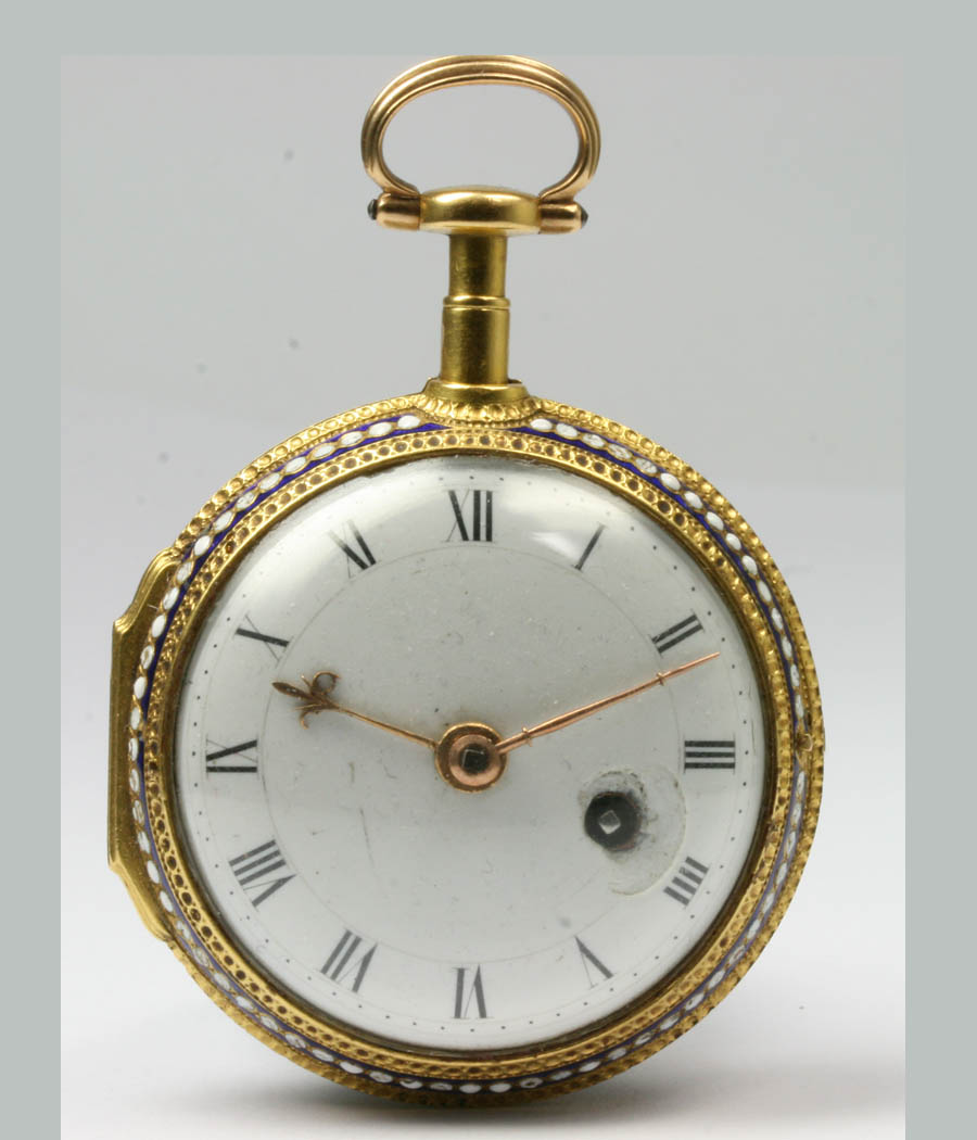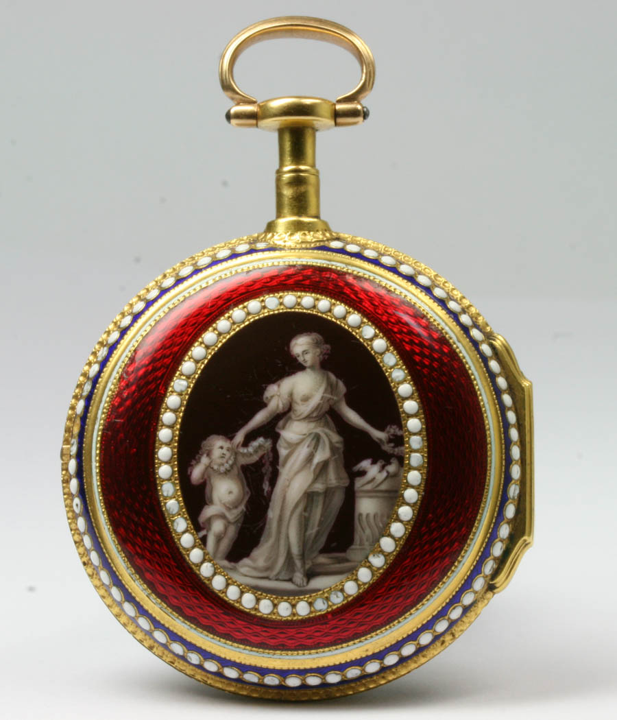 A rare pocket watch with special verge escapement Charles Haley, London N 1126 Dial: enamel, radial Roman hours case image cherub and girl with laurel wreath and doves Movm.: full plate movement, keywind, frosted, gilt, signed, chain/fusee, square tapered pillars, special verge parallel pivot adjusted escapement, three-arm brass balance, large "à fleurette" engraved and pierced balance bridge, silver regulator disc,